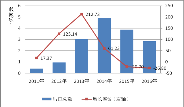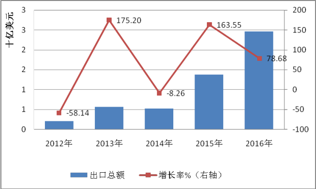 印度在2016年一跃成为我国光伏组件出口的第二大市场,2016年,我国对印度光伏组件出口金额24.59亿美元,较2015年同比增长78.68%。