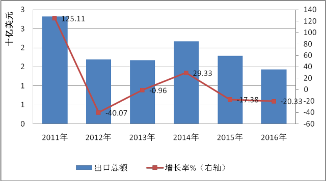 2016年,美国市场占中国组件出口的市场份额下降到11%,出口金额下降20.33%,为14.27亿美元。