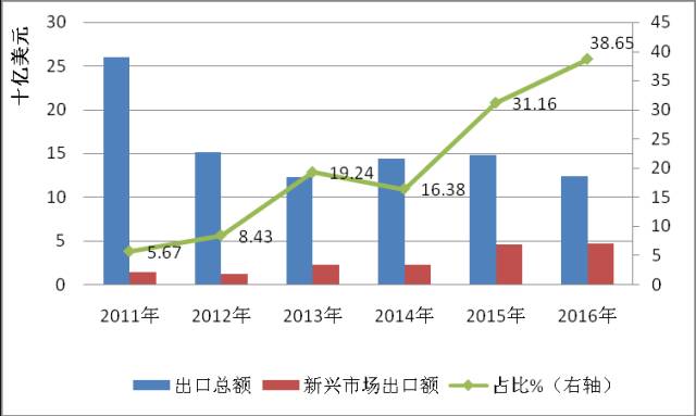 2016年,我国向一些新兴市场国家(本节新兴市场数据为中国信保标准,未包括OECD、港澳台、保税区)出口的光伏组件产品金额已累计至47.85亿美元,占中国光伏组件总出口量的38.65%。从下图可明显看出,新兴市场在我国光伏组件出口市场中的占比正快速提高。除印度市场以外、南美、中东等新兴市场也正在快速成长,这些新兴市场的规模化发展,有望在一定程度上弥补传统市场的需求下滑。